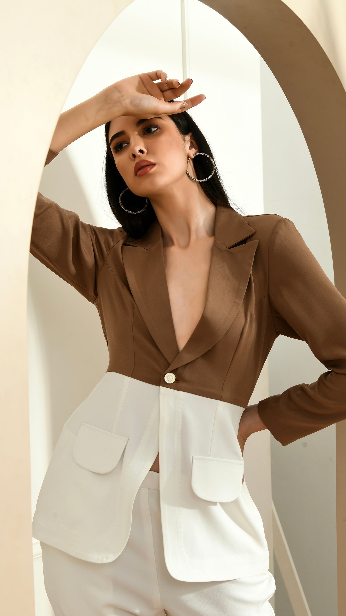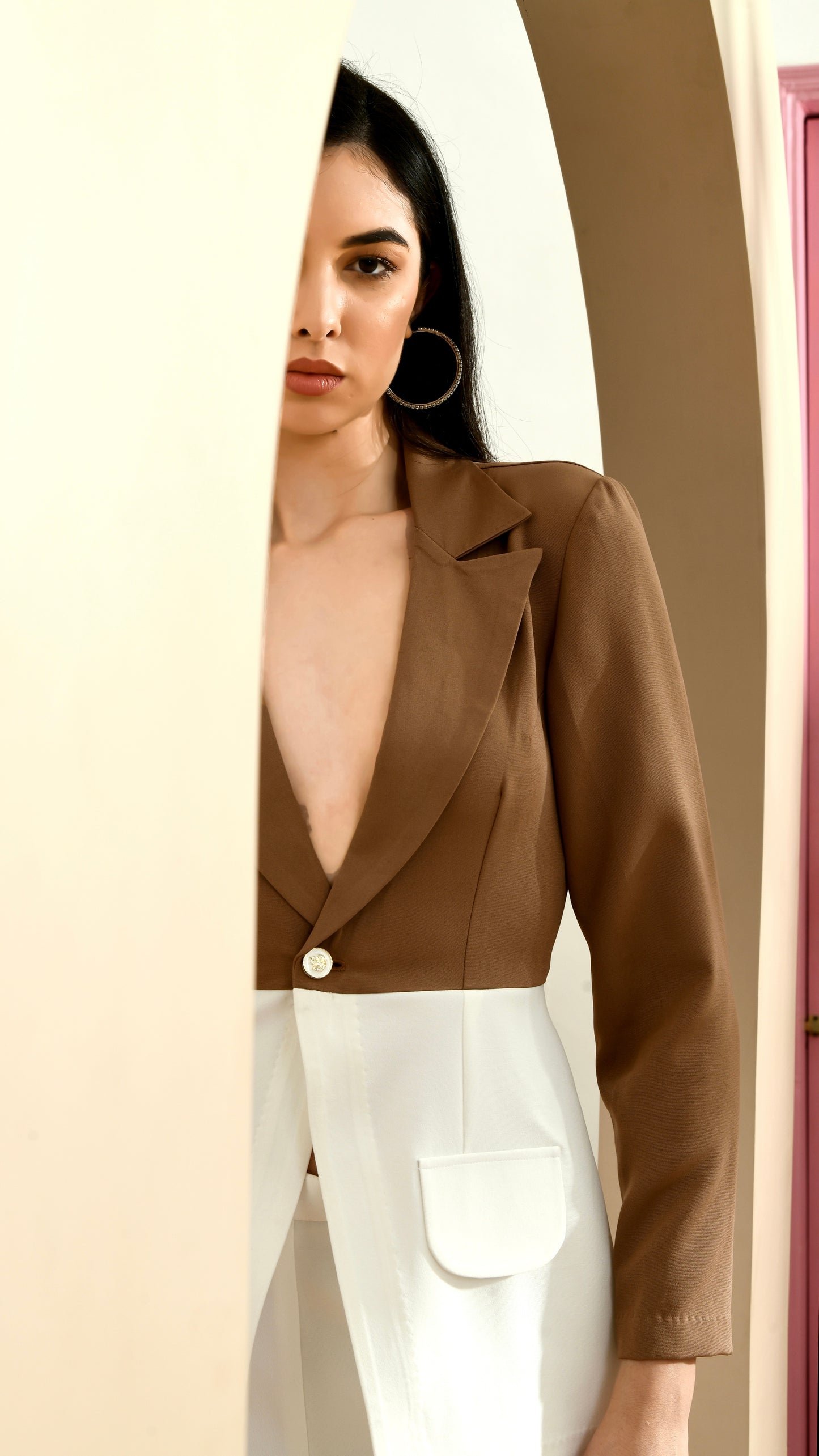 This elegant handcrafted Dual Tone Block Co-Ord Set is made of luxurious Luxe Banana Crepe material, featuring a color blocked coat and pants. Handmade with a minimal design by a renowned celebrity designer, this set exudes a professional and sophisticated style with its two-tone color scheme. Part of Heritage Classic Collection.