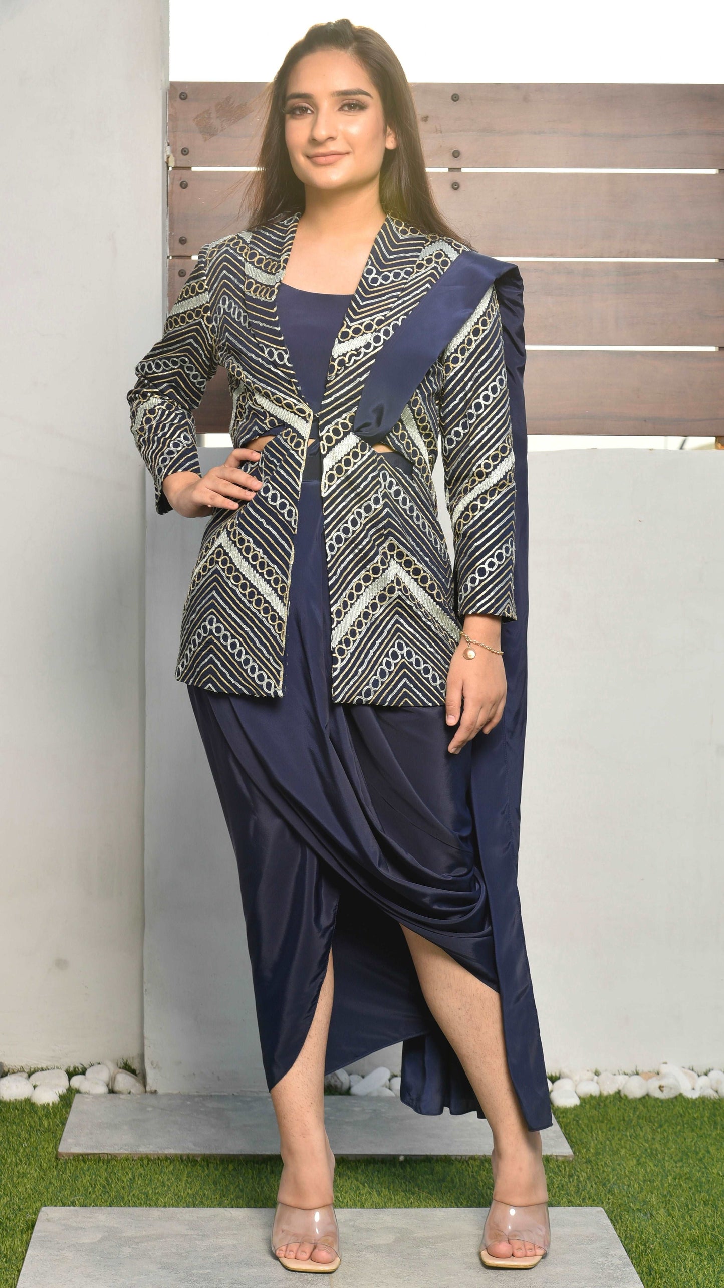 Unleash your inner celeb with our 3 piece Indo-Western Set in Sea Blue. Made with premium pure Chinon and crepe, this set includes an embroidered blazer, tube top, and drape skirt with attached pallu. Perfect for any occasion, its elegant look and deep blue color make it a statement piece designed by a celebrity designer.