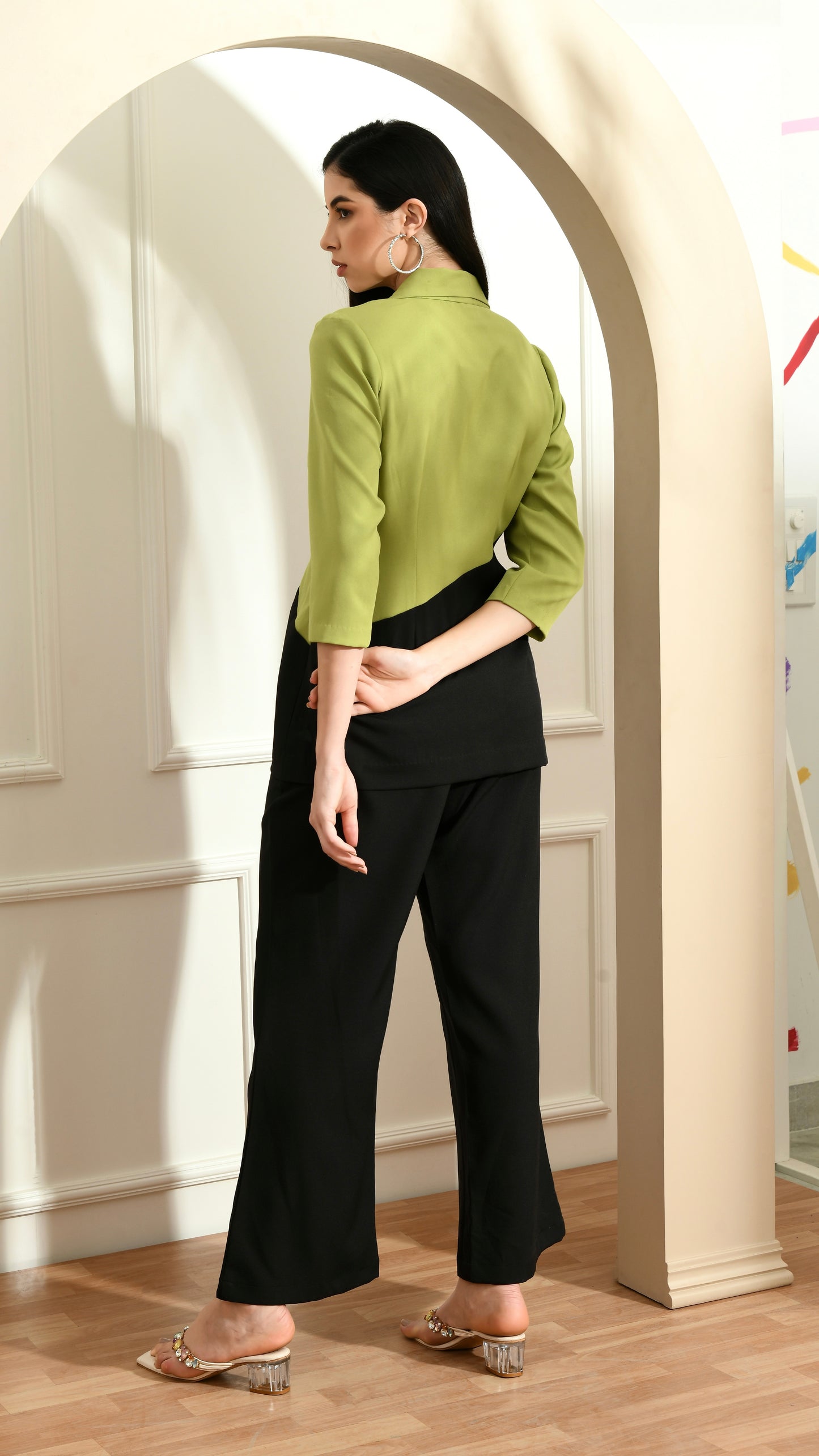 This Color Blocked Co-Ord Set in olive and black is a statement piece designed by a celebrity designer. The set includes a color blocked coat and pant, handcrafted with premium luxury fabric, specifically the luxurious banana crepe material. Stand out in style and comfort with this uniquely designed set.